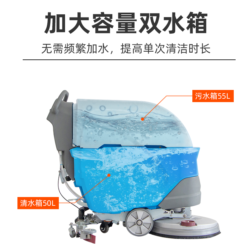 LT-M2型手推式工业洗地机,工作效率2300㎡/h,清洗宽度530mm,吸水宽度800mm,电池容量24V/100Ah,采用大功率品牌电机,广泛用于工厂、车间、医院、商场、机场、地下车库等场景,洗刷吸三合一,去污不留痕,充满电可以连续工作2-3小时,适用于6000㎡左右的工作场地。